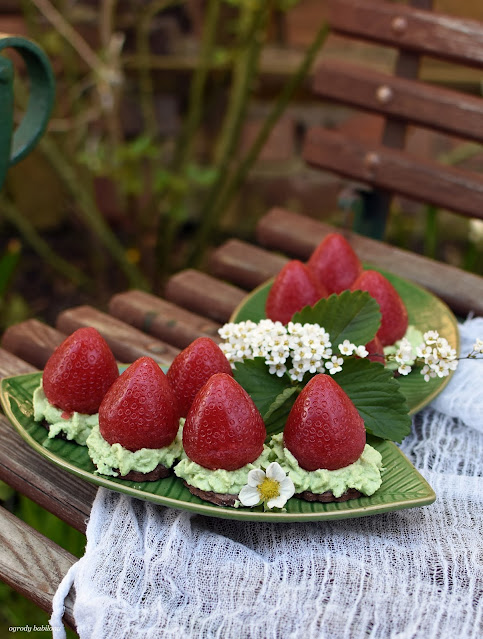 Kruche kakaowe ciastka, krem na bazie masła i mascarpone i góra zwieńczona galaretką w kształcie truskawki, składa się na bardzo ciekawe ciastko. Do wykonania ciastka potrzebna jest foremka w kształcie truskawki do deserów zwanych monoporcje. Ciasteczka z truskawkową galaretką, są pyszne i staną się ozdobą stołu podczas małych uroczystości rodzinnych.