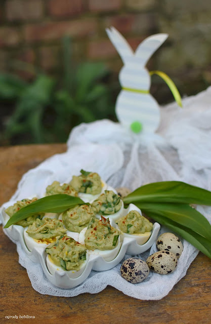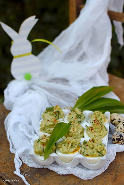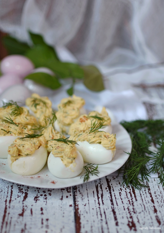 Płaty śledziowe pokroić na wąskie paski. Jajka ugotować na twardo, ostudzić i obrać ze skorupek. Przekroi na pół, a następnie owinąć paskami śledzia.