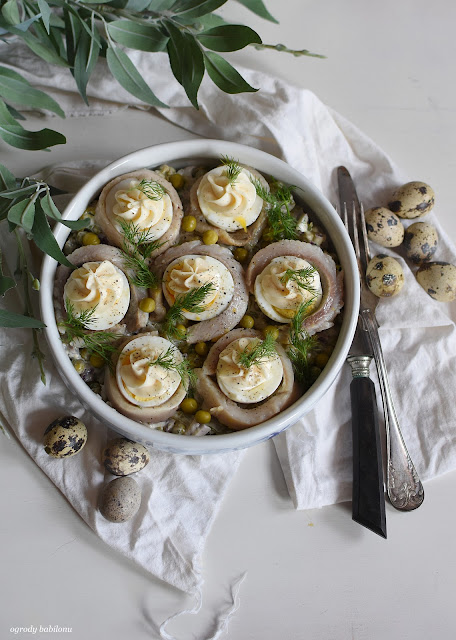 Jajka osadzone w śledziu podpatrzone tutaj, to połączenie pysznej i szybkiej do zrobienia sałatki śledziowej z jajkiem otulonej śledziem.