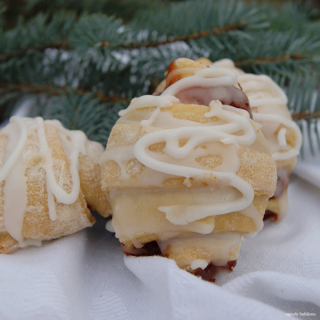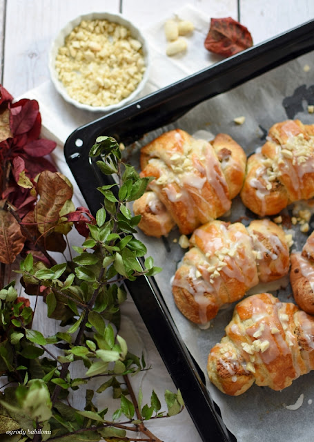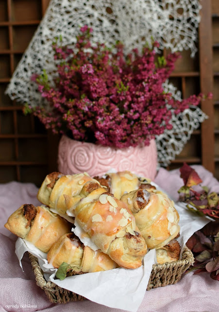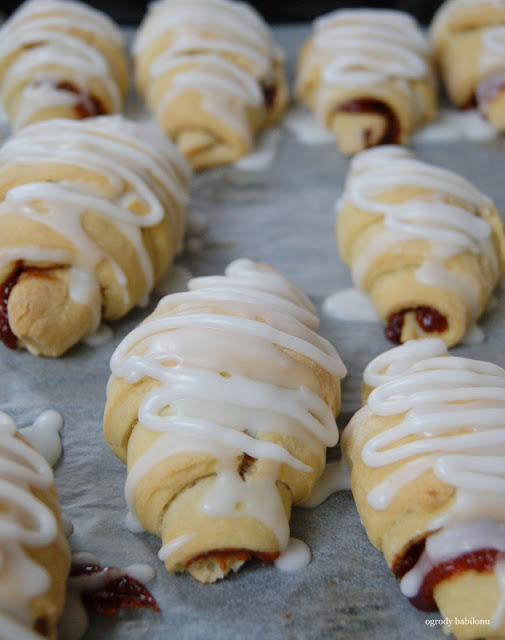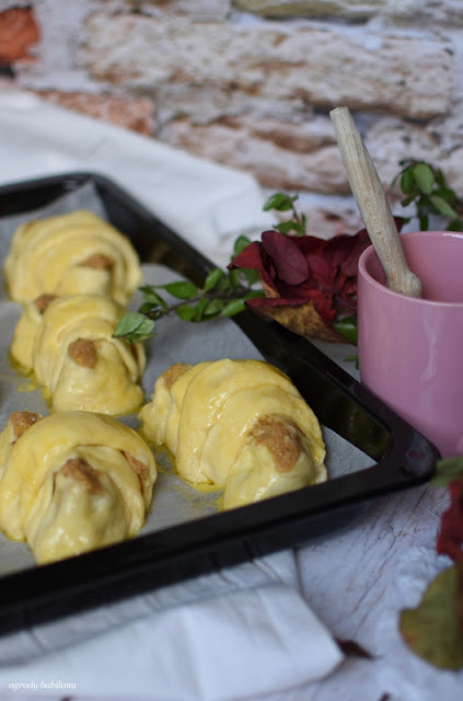 Rozgrzać piekarnik do 180º C. Rogaliki przed pieczeniem obficie posmarować jajkiem wymieszanym z mlekiem, solą oraz cukrem. Piec rogale około 15 minut, na złoty kolor.