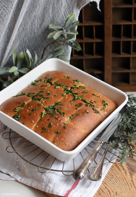 W nowym roku styczniowa piekarnia Amber piecze bułeczki na zakwasie i tangzhong z masłem czosnkowo - ziołowym, według przepisu z bloga Bread by Elise. Bułeczki z tego przepisu są mięciutkie, a masło czosnkowo - ziołowe sprawia, że dobrze smakują i pięknie pachną. Bułki w składzie mają zakwas pszenny i tangzhong. Tangzhong, to pasta z mąki gotowanej do temperatury 65° C na wodzie lub mleku, która sprawia, że poprawia się struktura pieczywa i wydłuża okres czerstwienia.