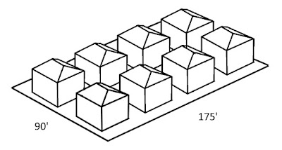 Where three lots once hosted perhaps three duplexes with two two bedroom units each (the Buffalo "2/2"), there are now eight fairly large (1800 sq. ft.) single-family homes, or, if homes were divided by floor, as many as sixteen one and two-bedroom units. A small lane (or really narrow street if you prefer) runs in between the homes, and cars can be parked alongside houses. The backyard is heavily truncated, but there is enough space for a small patio. If the above design were extended to another three lots on the opposite side of the block, the lane would become a small through-street, helping to open up the large blocks. Further, if the houses were made slightly smaller, I think it would be possible to fit in ten rather than eight. You can do the math.