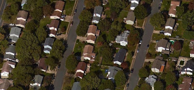 Finally, in some of the developments of the 1960s and 70s we see what are approximately square residential lots. Here, for example, is Herndon, VA, with lots of 90' x 105'. Interestingly, the ranch houses still "sprawl" across the wide lot, continuing to create the visual effect of a more or less solid wall of houses to a person going past: