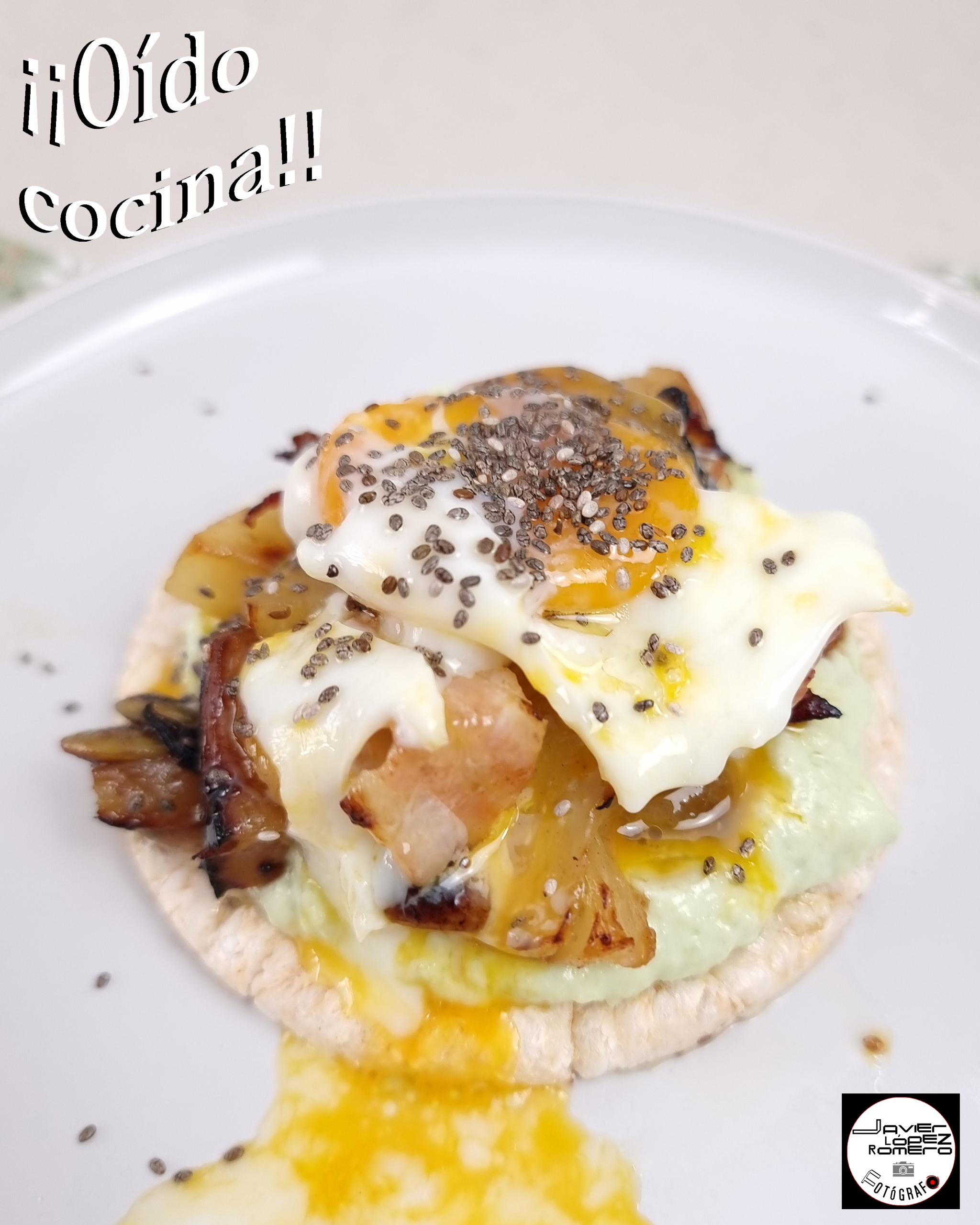 Tortita de arroz con crema de aguacate, panceta, piña y huevo