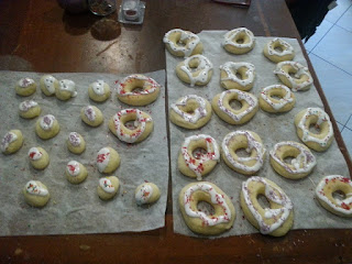 INGREDIENTI: 1uovo 70 gr zucchero 1 limone grattato Semi di una bacca di vaniglia Un pizzico di sale 250 ml latte 10 gr lievito di birra 100 gr burro morbido 550 gr circa di farina PROCEDIMENTO: impastare l'uovo lo zucchero la buccia del limone e semi di vaniglia sale e latte (io nella planetaria) aggiungere metà farina ed il lievito sciolto in poca acqua calda continuare a impastare e aggiungere poco alla volta il burro. Poi finire con il resto della farina fino a che la pasta è morbida ma non appiccicosa (per diversi minuti). Metterla in una ciotola unta d'olio coperta con pellicola in forno con la luce accesa fino a che non raddoppia di volume. Riprenderla e spianarla a circa un cm ( io ne ho fatte anche qualcune più basse). Con uno stampo per ciambelle prepararle e metterle su carta forno sempre coperte di pellicola sempre a lievitare in forno fino a che raddoppiano (circa 2 ore) togliere la pellicola e cuocere in forno a 200°C per circa 7 o 8 minuti. Farle raffreddare e decorarle. Io ho usato ganasce di cioccolato e glassa bianca confettini misti. Sono una bontà. ... e non sono fritti! E con gli avanzi dell'impasto mini bomboloncini sempre al forno