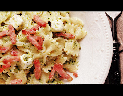 Farfalle fetával, brokkolival és fokhagymás sült szalámival