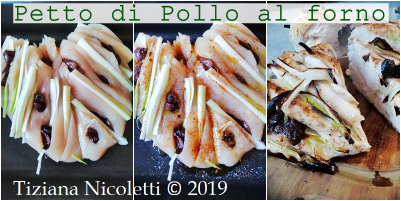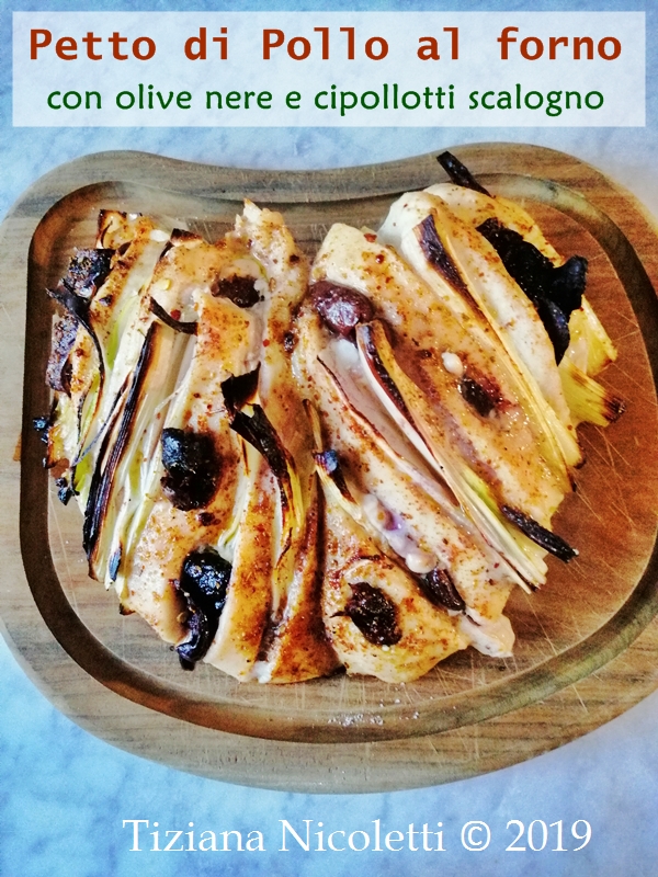 Sul petto di pollo intero praticate diversi tagli profondi. Mondate e affettate i cipollotti e denocciolate le olive nere (quelle del tipo sull'amarognolo ci stanno benissimo!) ed inserite, alternandoli, questi due ingredienti tra i tagli del petto di pollo. aromatizzate la carne con spezie di vostro gusto (origano, peperoncino, paprica, noce moscata, insomma ciò che più vi piace con le carni bianche), salate e irrorate con un pò di olio extravergine d'oliva.
