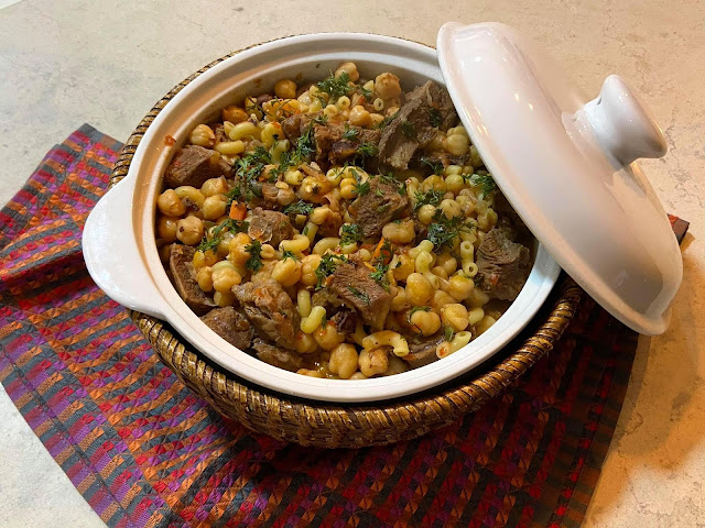 Quando a carne estiver mais macia, adicionar água. Quando esta estiver a ferver, adicionar a massa cotovelinhos, uma mão cheia por pessoa. Tapar novamente o tacho e deixar cozinhar.
