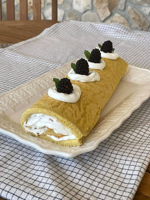 Adicionar o pêssego partido em pedaços pequeninos e o chantilly por cima. Enrolar com cuidado e colocar num prato próprio para tartes.
