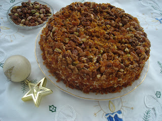 Krantzul astfel format se raspandeste pe toata suprafata tortului, acoperit deja cu samburii de migdale, alune de padure, fistic si nuca.