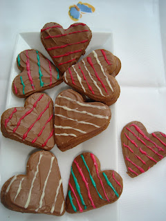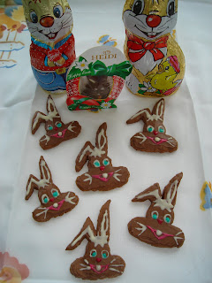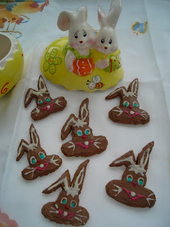 Pentru glazura, am pus prima data ciocolata cu lapte la topit pe baie de aburi,apoi am uns fiecare iepuras, ousor si inimioara. Ba le-am si suprapus si umplut cu cioco si la mijloc ;-)