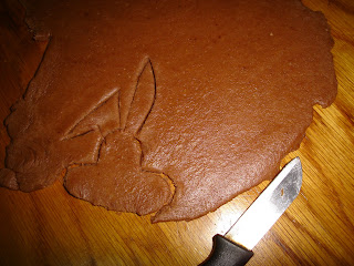 Primul aluat intins: iepurasii Quicky-m-am uitat eu bine la poza de pe pachetul de Nesquik si fara sablon, l-am trasat din cutit. Chirurg trebuia sa ma fac ;-)))