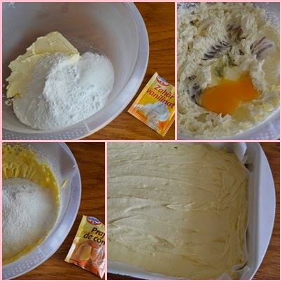 Blatul: Intr-un bol, untul se freaca cu zaharul praf si zaharul vanilat(foto1), apoi se adauga cate un ou(foto2) si se mixeaza pana se incorporeaza. Se adauga si celelalte oua, pe rand.