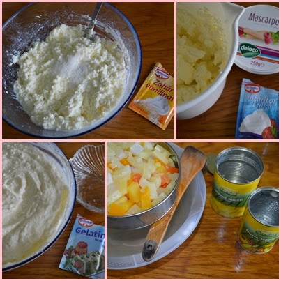 Branza proaspata se freaca cu zaharul si zaharul vanilat (foto1, jos). Frisca lichida se mixeaza cu intaritorul de frisca si se adauga treptat mascarponele(foto 2, jos).