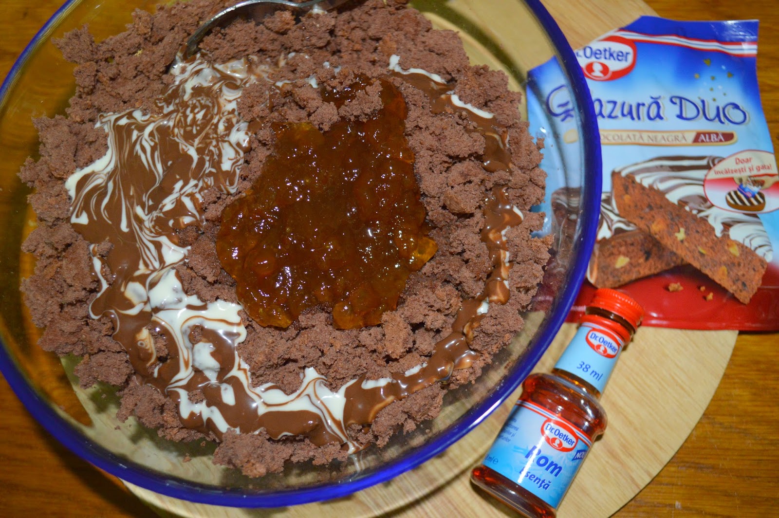 Pasul 3 Bilele cu rom: 1 plic de glazură ciocolată neagră se pregătește conform indicațiilor de pe ambalaj. Blatul se mărunțește grosier într-un vas, apoi peste el se adaugă esenta de rom, gemul de portocale sau de caise, aroma și glazura topită.