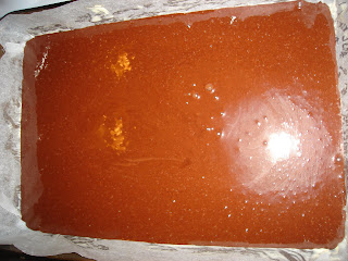 Peste primul blat se pune spuma de ness, blat si crema de mascarpone.Glazura se toarna calduta peste crema rece. Se da la frigider minim 3h. Se taie in patrate.