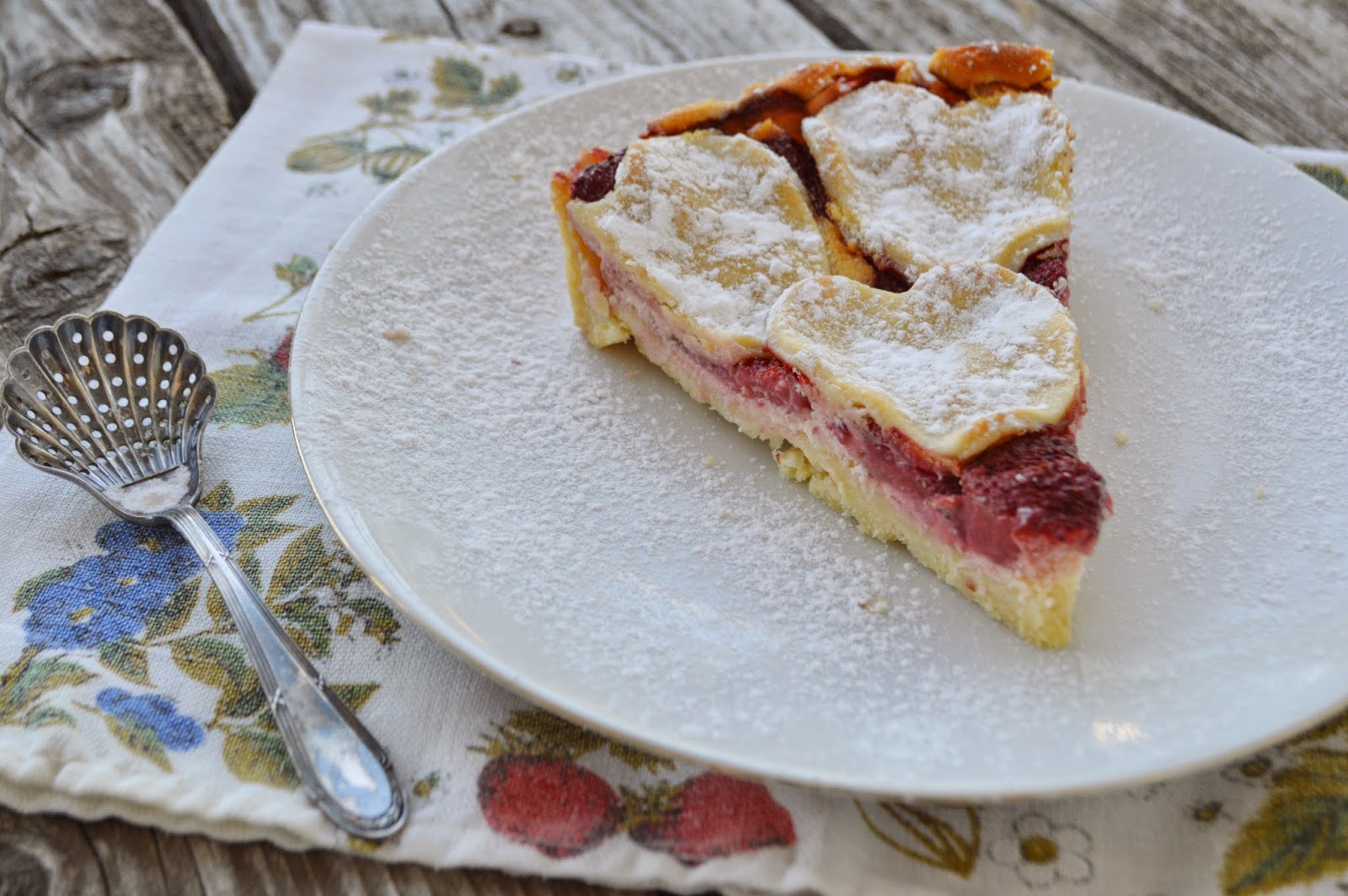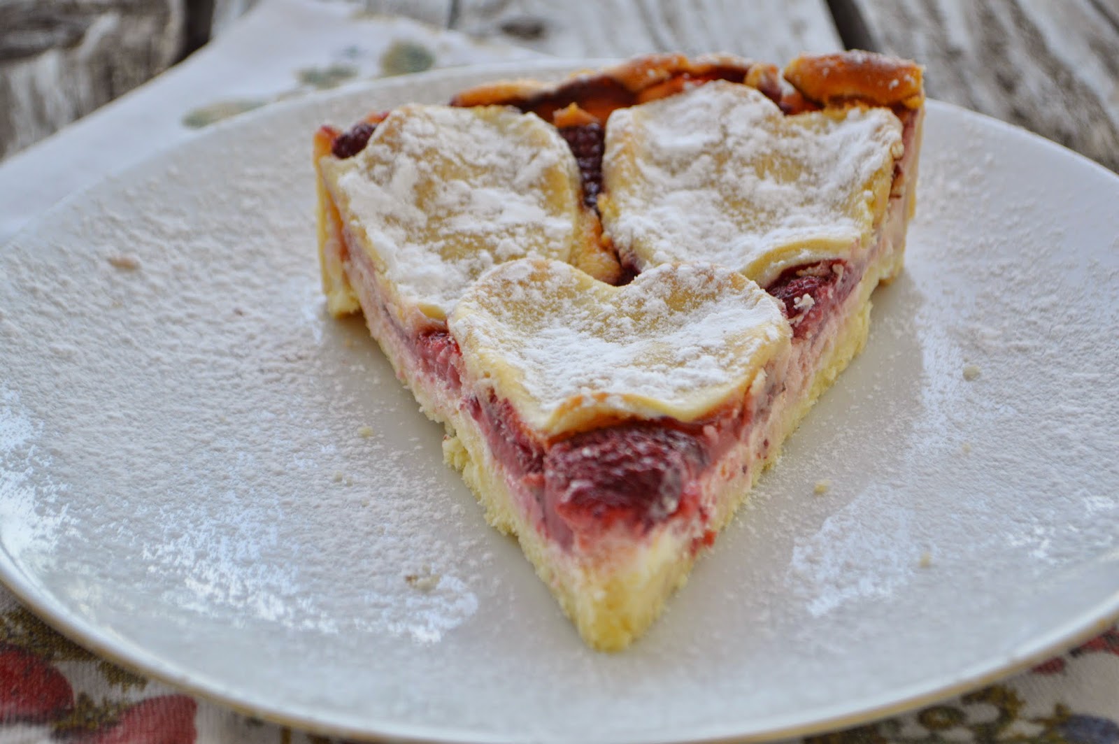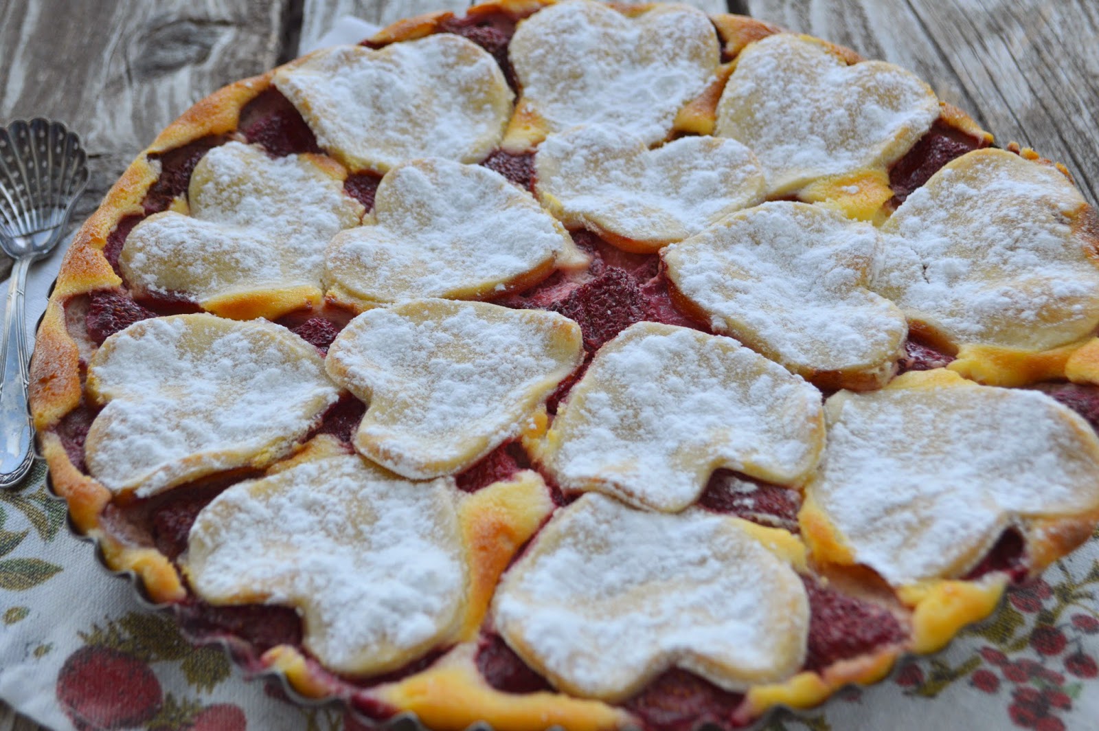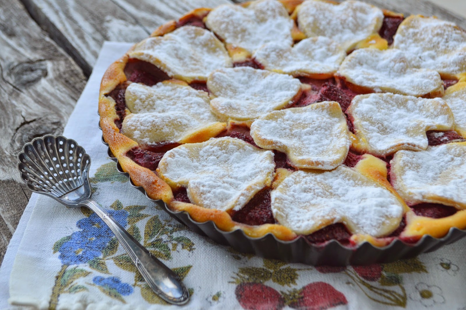 Pe cea de-a doua foaie de blat se pun toate fructele si se aranjeaza frumos, alaturi de ciresele confiate taiate in doua(foto 2, jos).