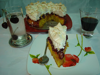 Am facut doua blaturi de cacao, o crema fiarta de vanilie si crema de lapte,cu visine, insiropat cu suc de visine. L-am acoperit cu plastelina de ciocolata in care am pus colorant rosu.