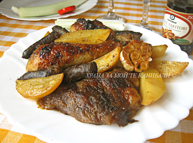 Такова печено често правя. Разликата е, че този път сложих настъргана портокалова кора с подправките върху пилето, които след изпичане нито се виждаха, нито усещаха, за да няма неудобни въпроси и смотолевени отговори. Иначе подправките за пилето са мащерка; за пържолите риган, в наденицата - кимион, но според моето скромно мнение те не се бият, а се съчетават добре. Другото ново този път на тази тава с печени меса е ЯКИТОРИ соса и марината за месо и зеленчуци - вместо с него, до сега правих глазурата на месото със соев сос и малко мед. И ако някой се чуди дали на всички се харесва? Не. Невъзможно е от 5 човека да се хареса и на петимата. Единия все ще е терсене и ще пита защо пържолите не са изпечени на скара с жар. Все едно мога да опъна скарата с въглища на остъклената тераса. Но това е друга тема.