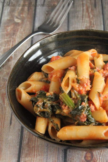 Rigatoni crémeux à la saucisse, épinards, ail & sauce tomate