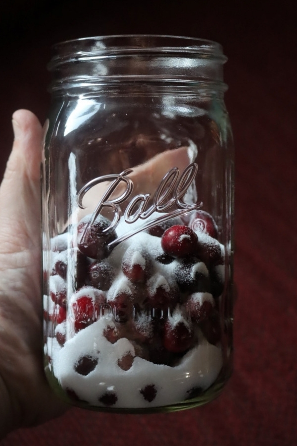- Load 1 1/2 to 1 3/4 cups of raw cranberries into each quart jar. Add 1/4 to 1/2 cup sugar to each jar.