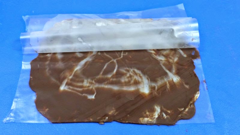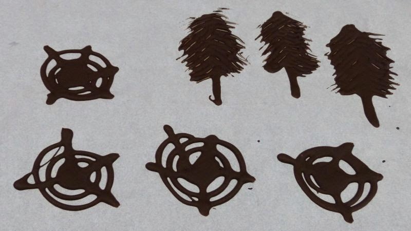 Amb un mànega i un cornet ben petit, farem decoracions de xocolata, diferents formes sobre un paper. Es deixen refredar.