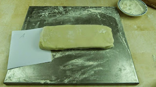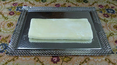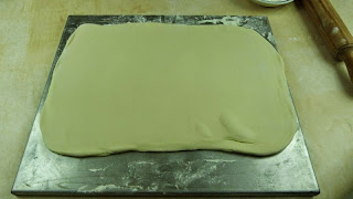 Empolsinem el marbre i amb un corró l'aplanem. Hem de mirar de tenir sempre una mica de farina sota la massa. Si no amb l'ajuda del corró s'aixeca i s'empolsina. No es pot agafar la massa a la safata, perquè es farien malbé els fulls (quan s'estira es nota si s'agafa).