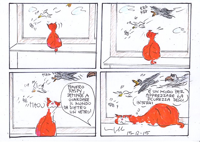 riflessioni, aspirazioni e frustrazioni di Rasputin, gatto rosso a coda corta,rigidamente "indoor", recluso in un appartamento del VII piano senza balconi,costretto ad osservare e cercare di annusare il mondo dietro i vetri, spettatore perplesso davanti ai comportamenti incoerenti dei suoi umani, quali non voler fare entrare i topi e non voler far uscire i gatti.
