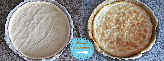 . Coloque a massa folhada sobre uma tarteira, sem retirar o papel vegetal (se for congelada, deixe-a descongelar primeiro à temperatura ambiente). Pique a base com um garfo e leve ao forno até dourar, cerca de 20 minutos. A meio do tempo, quando verificar que a base está insuflada, use uma faca para dar uns golpes no centro e na junção com as laterais, de maneira a que o ar se liberte e a base assente. Desta forma é desnecessário usar a técnica dos feijões e a massa fica mais bem folhada.. Quando a massa folhada estiver douradinha, retire do forno e deixe arrefecer.