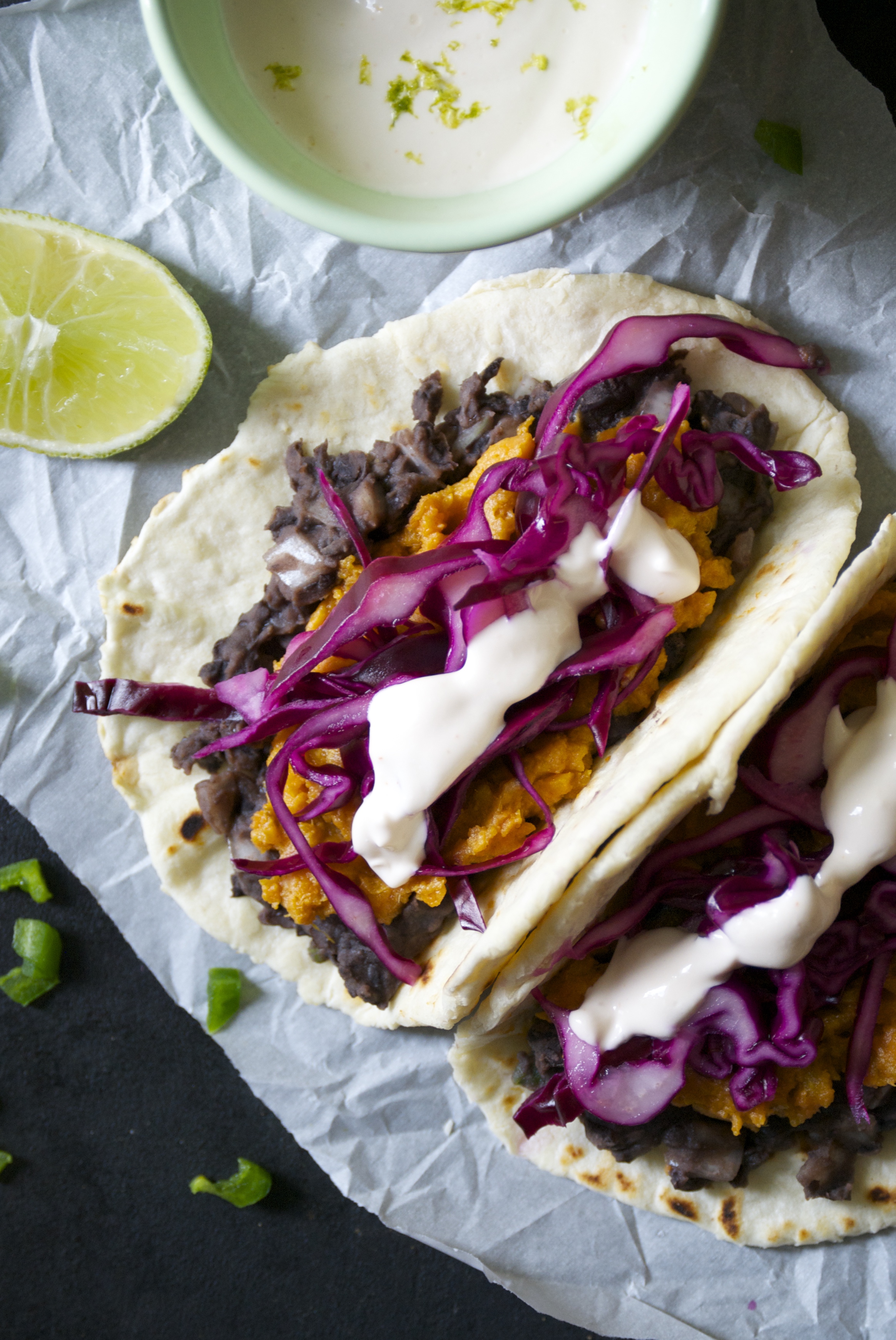To assemble and serve the tacos: warm tortillas and top with a spoonful of black beans, a spoonful of sweet potatoes, a bit of cabbage and a drizzle of the sour cream sauce. Enjoy!