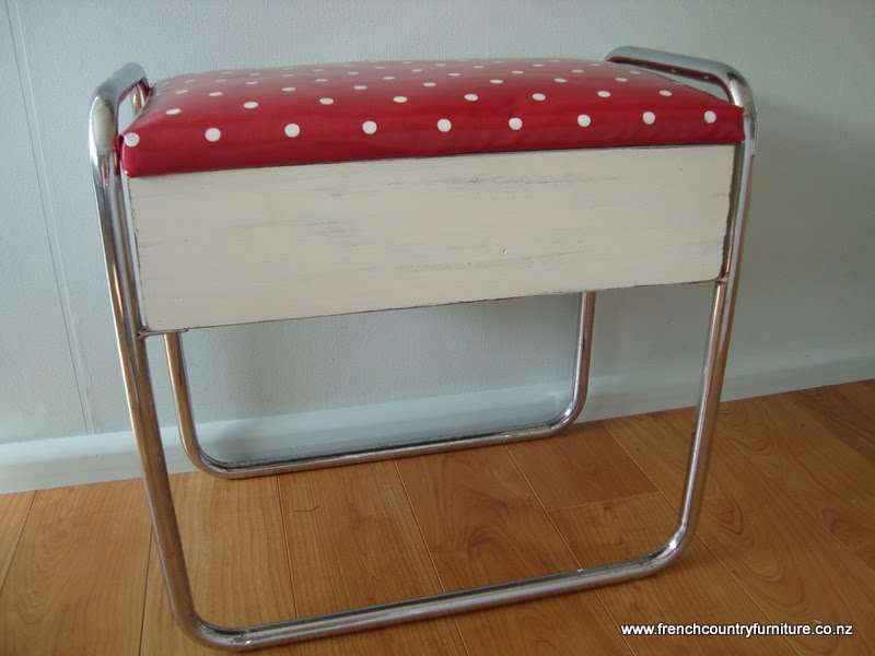 Then I have to have a think about what I am going to start next...actually no I don't, I will be finishing some half-done projects that I pushed aside so I could get onto my first custom order. There is a duchess with lovely rope carved edges that has been sealed and has the first coat of cream paint on it. It has a matching bedside that I have already finished but not taken photos of yet (must do that!). The other thing half-done is a cute wee retro-style piano stool (that's what I think it is, anyway)...most unloved in its 'before' state but will look super cute once I have finished it, hopefully! I have almost finished painting the wooden box part of the seat, then I will recover the seat/lid in red and white polka dot oilcloth. The chromed legs will come up beautifully with a scrub, I'll put it all back together, and then all will be revealed. I am also painting a little lamp table for my mother, in cream. It has a couple of coats on it so far and is looking much better already....I am still always amazed and impressed about what a coat of paint can do!