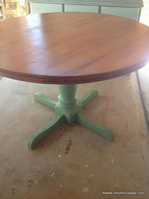 I didn't take a full before shot, mainly because I had to take the table top off the base to get it home, then I painted the base before reattaching the table top (it made it much easier to get at without hitting my head, always a bonus!) The base is painted in my favourite custom shade of vintage green - Annie Sloan Chalk Paint in Duck Egg + Antibes Green (1:1).