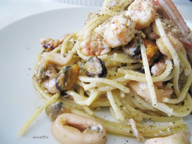 A fine cottura aggiungere gli scampi, le cozze, le vongole pulite dai gusci, sale e pepe