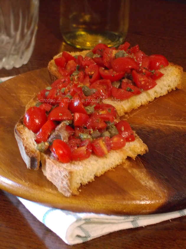 Si tagliano le fette di pane casareccio, si fanno tostare leggermente in padella o in una piastra, si mette un filo di olio extra vergine di oliva.