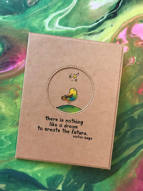 For my card I started with Neenah Desert Storm cardstock, cut out a stitched circle for the opening on the front panel. Then I lined up the front panel to the card itself and penciled around the opening so that I could stamp the image to fit inside the circle.