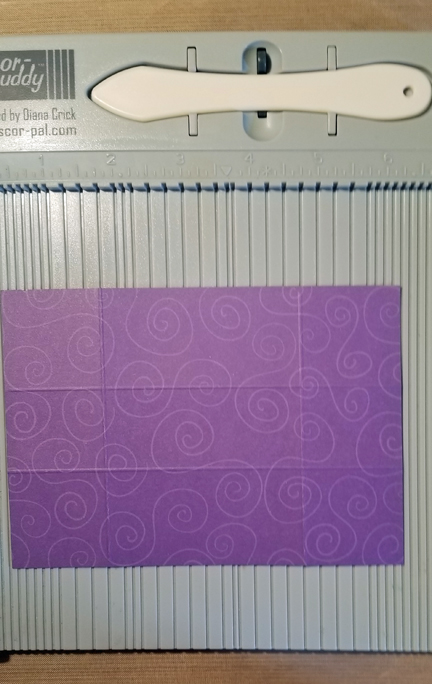 Start by taking a piece of patterned paper sized 8.5 x 5.5 and score on the long side at 2:, 4: 6″ and 8″.