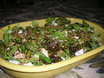Arrange the lettuce in a salad bowl. Arrange the asparagus, cheese, and pumpkin seeds over the lettuce, and drizzle the dressing over the salad immediately before serving.