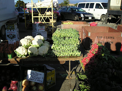 And so home with the goodies. I restrained myself most ferociously (yes, really) because we still have a fair bit of stuff in the fridge from last week. So, from the bottom, clockwise; garlic, red and Spanish onions, fresh shiitake mushrooms, mutsu apples, russet apples, quinces (yes, really!), vast amounts of leeks (3 bunches - 9 big fatties - for $5!), radishes, basil, celery, broccoli and Brussels sprouts. I've been looking for quinces for years; this was the first time I've seen them. I'm told that if you want them, you had better get there early.