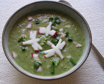 Purée the soup with 1 tablespoon of the reserved chopped onion tops and the milk or cream, and sea salt and pepper to taste. Serve garnished with a radish or two, chopped finely and mixed with the last tablespoon of chopped green onion tops.