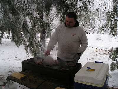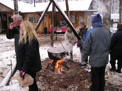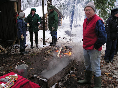 The fire in which the rocks were heated, and the steaming trough of sap. Lots of little fires and smoke here - we left smelling slightly sweet, sausagy and smokey.