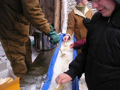 Next, the boiled syrup is poured over a bed of crushed ice, where it quickly firms up enough to be scooped up with the aforementioned sticks.