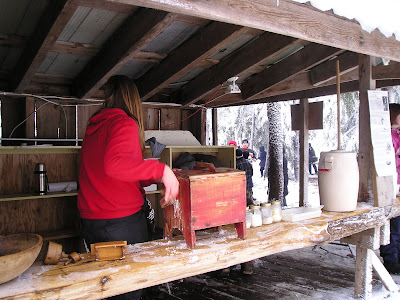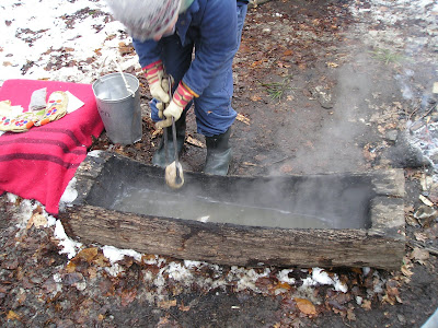 Here we see how maple syrup was converted to sugar by the First Nations people. (They were just using sap here; but originally it would have been boiled down to syrup first, and the final conversion to sugar would have been done by the addition of hot rocks. This allowed a much higher level of control over a rather tricky process - especially when you are doing it without metal or even glazed pottery vessels.)