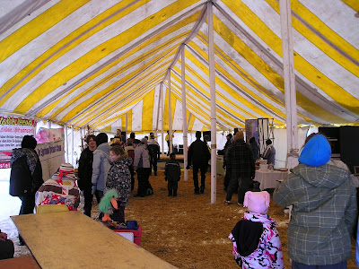 We jounced across a large, windy (did I mention that!?) corn field towards the site of the festival. Gigantico tent ahoy! Warning: unlike other maple festivals I have been to, Holstein charges an admission fee. $7 for adults, children under 12 free.