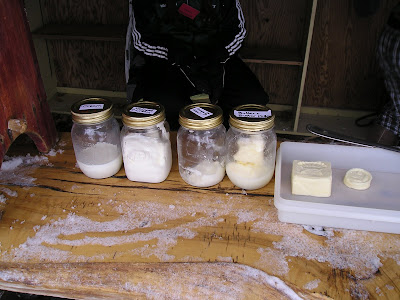 Here's a little display of the stages between cream and butter, as well as some washed and stamped butter pats.
