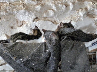 Cats asleep on the top of the "kitty condo". Lori fills cages with straw and covers them with blankets, and the cats stay in the barn all winter, and keep the mice away.