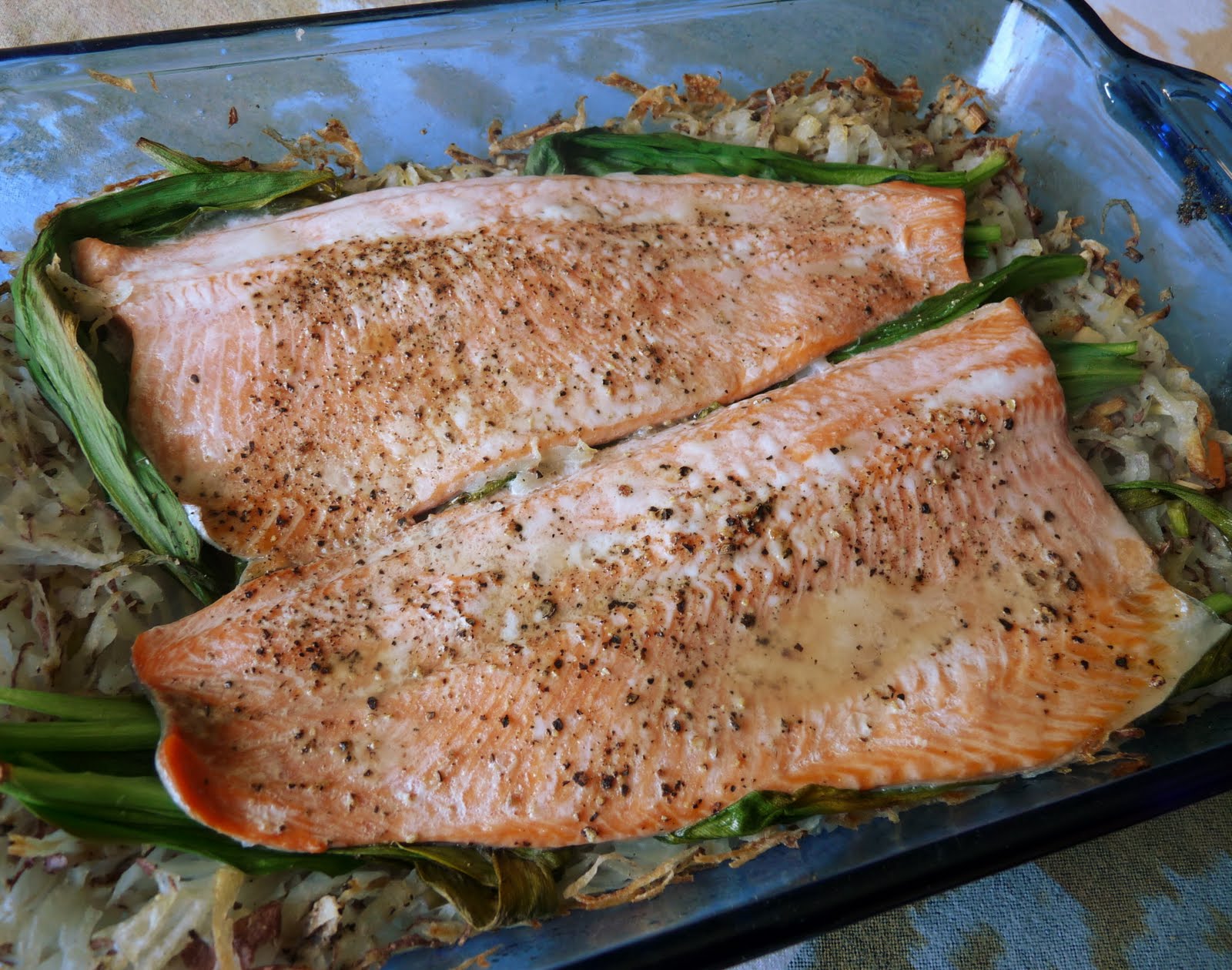 Now it is time to arrange all the ingredients in what should be a somewhat snug baking dish. Arrange the onion slices, tomato slices, mushrooms if using, and liver in overlapping layers in it. Lay your slices of bacon over top, if you are using them.