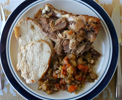 Modern cooks, or even cooks for the entire last two centuries however, are and have been of the opinion that roast turkey is not at all lost, but in fact the only way to proceed. It is a method that does have its drawbacks though; the white breast meat cooks faster than the dark legs, and so it is prone to being served dried out and overcooked. Furthermore, unless there is someone in the family who is adept at carving, it's a lot easier to cut up the bird before it is cooked, and then just have to slice the boneless breasts before serving. You don't have to worry about "performing" in front of your guests, while the rest of the meal is either scorching or getting cold, and if you find it easiest to put your hands all over it while you cut it up, no problem! It's about to be cooked for several hours anyway.