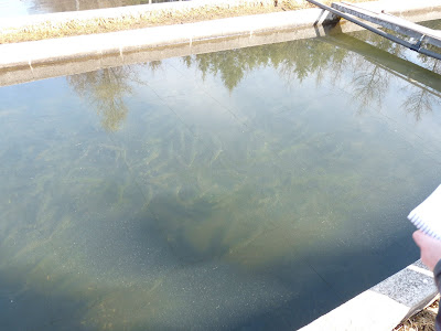 The water runs outside and rejoins more water from the springs which runs into the outside raceways. This is where the largest fish are, the ones that are breeding stock or trout that are large enough to be harvested, or nearly. There are 3,000 to 3,500 fish in each section of the raceways.