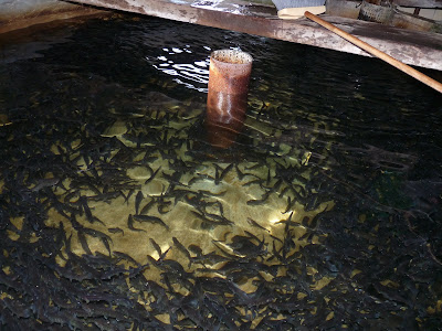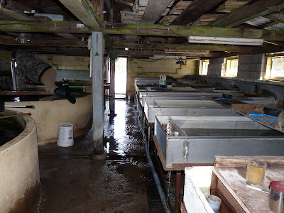 The whole hatchery is just one big room, with cement tanks on one side for the mid-sized fish, and the table-top tanks on the other for the small fry and eggs. All the tanks have water slowly but constantly running though them. They still need to be cleaned of silt, etc, and an employee was cleaning one of the tanks as we were there.