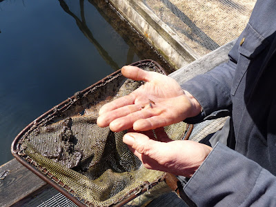 It turns out this is a very special spot for raising trout. Trout need clean, constantly moving water. The water comes from 2 springs about 400 metres further up in the woods. The water flows down, partly underground and partly through beds of wild watercress. By the time they reach this little series of dams, the water is rich in silt and nutrients and tiny wild fairy shrimp.